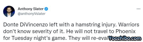 勇士赢球但新援迪温琴佐遭遇伤病,据勇士跟队记者Anthony Slater报道,迪温琴佐的左腿筋受伤,目前还不清楚伤势的严重程度,他将不会随队前往菲尼克斯挑战太阳,留在湾区养伤,勇士将对他的伤势进行复查。