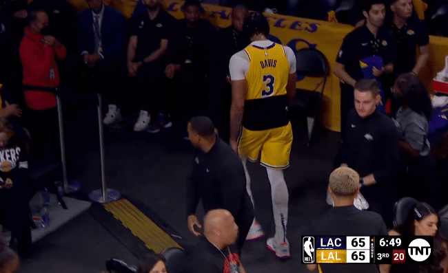 浓眉重摔倒地这一幕真是太惊险,浓眉真的伤不起;不过第三节6分49秒,湖人暂停,浓眉下场休息,并且站在场边接受临时治疗,并且戴上护具,站在球员通道附近;浓眉的心情很不错,和别人有说有笑。