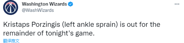 上半场比赛,奇才内线波尔津吉斯在一次上篮中踩到了罗齐尔的脚,扭伤了左脚踝。随后奇才官方宣布,波尔津吉斯因伤退出本场比赛。