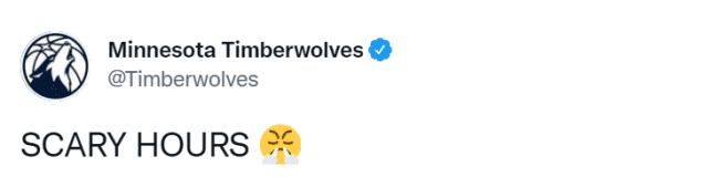 森林狼官媒配上的文字是“SCARY HOURS(恐怖时刻)”,而这恰恰是此前篮网宣传杜兰特+欧文+哈登三巨头的台词。不过,由于欧文拒绝接种疫苗,杜兰特受伤,哈登被交易离队,篮网三巨头并没有走向成功。