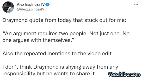 格林公开说了很多话,其中一句“一场争执需要两个人才行,一个不行,没有人会跟自己争执”遭质疑,美记者Alex Espinoza IV表示,他认为追梦并不是在逃避责任,但是显然,追梦想要其他人“分担”走一些责任。