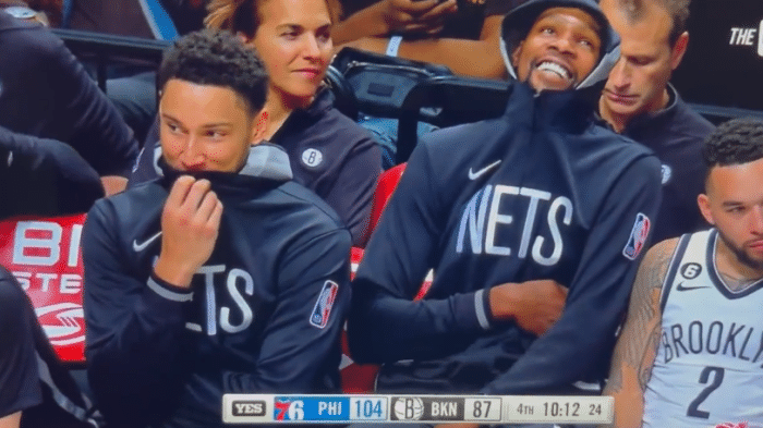 篮网惨败76人:三巨头首秀合砍28分 杜兰特西蒙斯坐场边咧嘴大笑