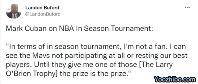 此前,库班曾表示自己对季中锦标赛不感兴趣,打算到时候轮休当家球星,或者干脆不参加。当时,他在镜头前说:“就季中锦标赛而言,我不是它的球迷,当然不是。我考虑让我们最好的球员休息,或者独行侠队完全不参加这个比赛,除非他们给我一个奥布莱恩杯,这样的奖励才算是奖励。”