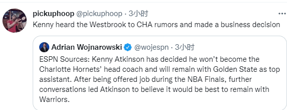 pickuphoop发推调侃:阿特金森听说了威少去黄蜂的流言,因此他做出了决定。