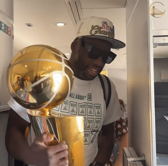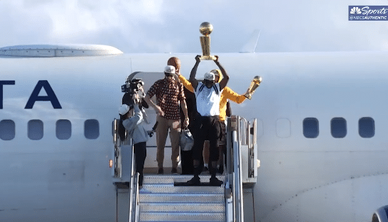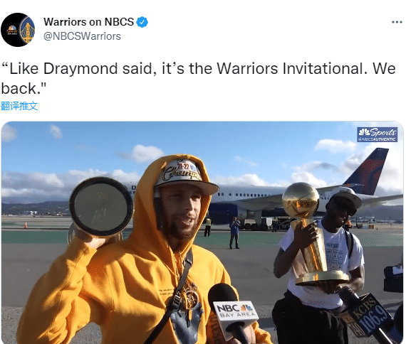 勇士全队下机之后,库里扛着FMVP奖杯并且抱着篮球接受采访,还和机场的一些人击掌庆祝,之后登上大巴;格林全程抱着奥布莱恩杯。