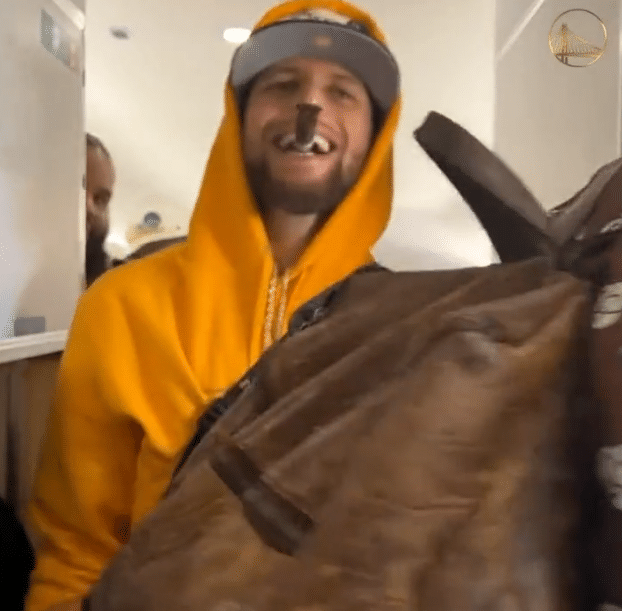格林身穿嘲讽凯尔特人的特制T恤,抱着总冠军奖杯走在最前面,汤普森背着双肩包紧随其后;库里叼着雪茄并且紧紧握着FMVP奖杯;之后格林高举奖杯以及库里举起属于他个人的FMVP奖杯和纪念篮球,现场沸腾了,无数球迷排队迎接英雄们回家,集体欢呼呐喊。