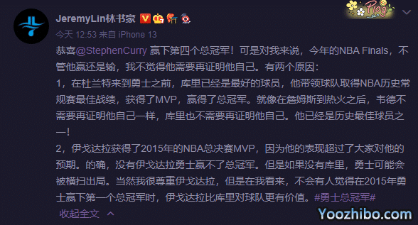 赛后曾经在勇士效力过的林书豪力挺库里的言论引发一定争议,他的内容是: