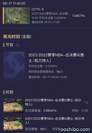 勇士夺冠之战的收视率也相当高,国内电视台直播,根据数据显示,这场总决赛G6的收视率非常高,在工作日的上午,平均收视率0.6871%,巅峰时刻的收视率高达0.8844%,同时间段排名全国第一。