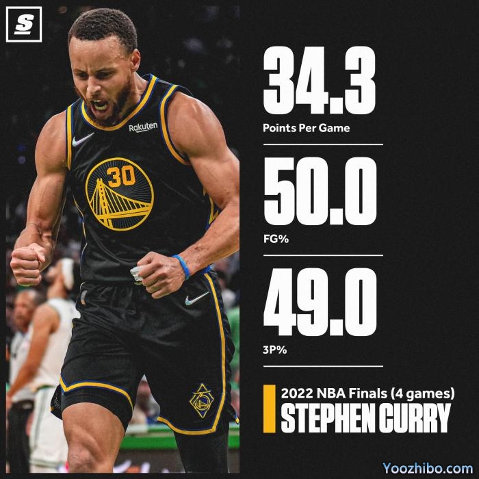 总决赛四场打完,库里场均狂砍34.3分6.3篮板3.8助攻2抢断,投篮命中率为50%,三分命中率为49%;G4关键一战,库里43+10狂刷历史纪录——总决赛连续4场至少命中5记三分历史第一人;34岁后总决赛至少40+,比肩乔丹和詹姆斯成历史第3人。