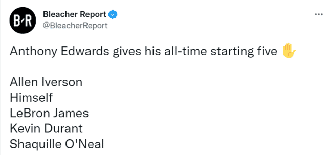 来源:24直播网06-04 22:0124直播网06月04日讯 森林狼的20岁状元爱德华兹总是充满自信,单从他评选历史最佳阵容这件事,就可以看得出来。北京时间6月4日,爱德华兹在采访中公布了自己心中的历史最佳阵容,他的答案是:艾弗森、爱德华兹、詹姆斯、杜兰特和奥尼尔!显然,他用自己顶替了经常出现在这个位置上的“飞人”迈克尔-乔丹。