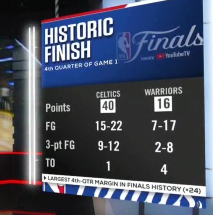 据统计,凯尔特人末节22投15中、三分12中9轰下40分,勇士防不住对手,进攻也哑火,第四节17投7中、三分8中2仅仅拿到16分,末节狂输24分葬送比赛。