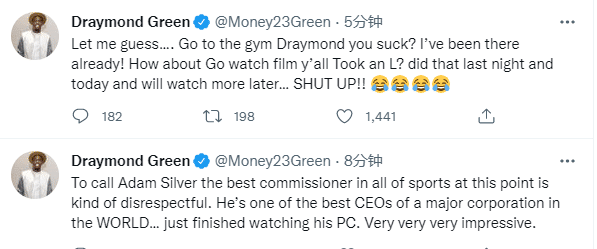 格林全场12投2中拿到4分5助攻11篮板3失误以及6次犯规,他是勇士遭逆转的一大罪人,防守态度不积极,被霍福德打爆,G1赛后被骂惨了;今日格林发文回应质疑,发推写道:让我猜猜(你们要说啥)……追梦你个垃圾赶紧去训练?(在你们说之前)我就已经在训练馆了!还是说,你们输球了赶紧看录像去?(在你们说之前)昨晚上我就看了一遍,而且今天我还要再看很多遍……闭嘴吧你们这些人(4个笑哭表情)