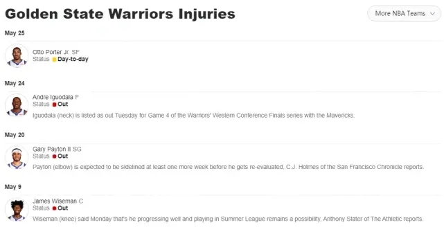 来源:24直播网05-26 16:1424直播网05月26日讯 ,勇士和独行侠将在明天迎来G5大战,最新伤情已经出炉。独行侠一方还是老样子,小哈达威因左脚手术继续缺阵,勇士一方,除了确定缺席的小佩顿(左肘骨折)、伊戈达拉(颈椎伤病)、怀斯曼(右膝伤病),波特处于每日观察的状态,出战成疑。