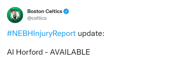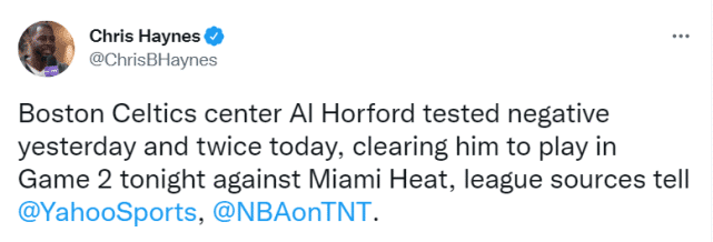 凯尔特人官方宣布,霍福德解除协议,可以出战东决G2,此前他因触发协议缺席了东决G1的比赛,季后赛至今,霍福德为凯尔特人出战11场,场均贡献13分9.4篮板3.4助攻1.1抢断1.4盖帽,攻防两端都是球队的重要成员。"他感觉很棒,这(霍福德回归)是出乎意料的事,”绿军主帅乌度卡说道。此前,霍福德曾被认为难以出战G2,结果绿军没有放弃,一直在对他进行检测,名记海耶斯透露,霍福德昨日检测阴性,今天连续两次阴性,终于在赛前获得了参赛许可。