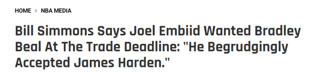 因此,当恩比德在被淘汰出局后,说出那句“哈登不再是火箭的那个哈登了”,也就并不让人感到意外了。 此前,美媒The Ringer曾建议76人用先签后换的方式和奇才交易,在今年休赛期送走哈登,换来比尔。今年3月份时还有美媒报道称,比尔想在今年休赛期加入76人,联手哈登、恩比德打造三巨头阵容,但这一报道没有得到更多媒体的证实。
