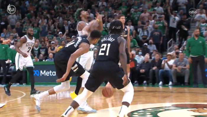 上半场还剩0.9秒,斯玛特和泰斯在外线疯狂包夹字母哥,斯玛特抢断之后被字母哥打手犯规,裁判吹罚字母哥投篮犯规,斯玛特获得三次罚球的机会,如此吹罚引争议,勇士球星德拉蒙德-格林发推写道:哇哦,不太好吹的一球;米切尔发推:在抢七比赛中这样吹吗?