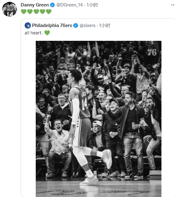 76人官方晒照向格林致敬,格林本人回应5个爱心表情;今年季后赛,丹尼-格林出战12场,场均上场26.6分钟,得到8.6分3.1篮板1抢断,三分命中率40.8%;新赛季格林的年薪是无保障的1000万美元,惨遭左膝韧带撕裂的大伤,职业生涯令人堪忧。