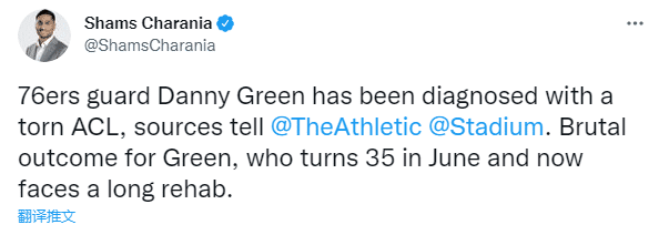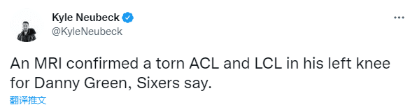 在G6生死战上,丹尼-格林在第一节不幸被恩比德撞伤,遭遇严重的膝伤,无法走路而被抬回更衣室,因伤提前退出比赛;如今35岁格林的检查结果出炉,76人随队记者Kyle Neubeck报道,格林遭遇的是左膝前交叉韧带撕裂以及外侧副韧带撕裂,他将面临漫长的康复期。