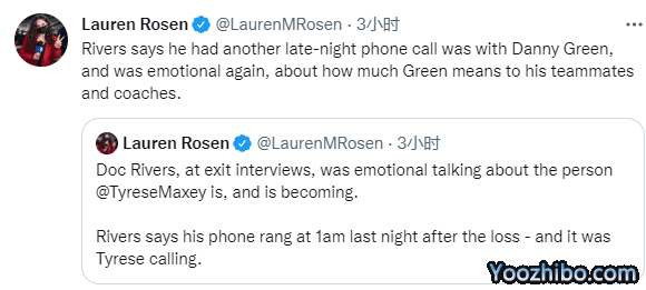 76人高管确定里弗斯下赛季继续执教球队,在赛季总结大会上,里弗斯透露昨天凌晨一点左右,马克西和丹尼-格林给他打电话,这让他十分激动;其中马克西想和里弗斯见面,讨论下周进行训练的话题,老里拒绝了马克西,让他先好好休息至少一周。