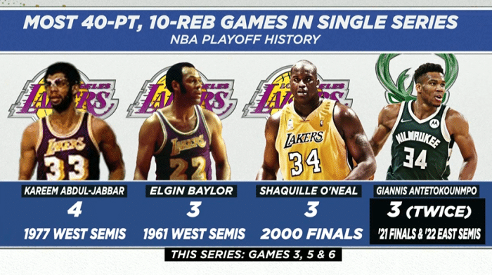 6、字母哥成为2001年奥尼尔之后首位季后赛单场40+20的球员,近21年第一人。