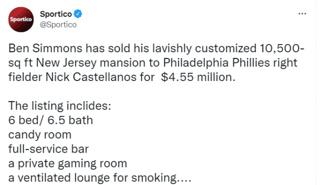 来源:24直播网05-13 16:1524直播网05月13日讯 ,据知名体育商业媒体Sportico报道,篮网球星本-西蒙斯以455万美元的价格将自己定制的新泽西豪宅卖给卡斯特拉诺斯,后者是一位职业棒球运动员。西蒙斯这座豪宅面积约975平方米,有6个卧室、6.5个卫生间、游戏室、私人电影院等设施。走廊里,还陈列着他各个时期的球衣。西蒙斯的挂牌价是500万美元,最终以455万美元成交!