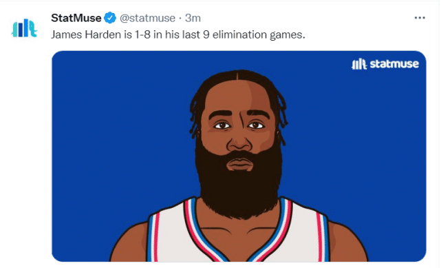 第五,Statmuse还嘲讽哈登在季后赛打球毫无压力(这是哈登的原话)。他的场均得分、场均出手数和场均命中数均为雷霆时期以来新低。他的投篮命中率也是2014年以来新低。