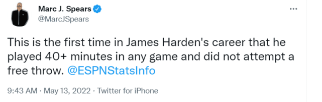 最后,名记斯皮尔斯还补充了一个数据。这是哈登生涯出战至少40分钟的比赛里,第一次全场没有任何罚球。对于罚球闻名的哈登来说,这也确实太尴尬了。不少球迷抨击他这场比赛打得毫无活力,也不够有侵略性。