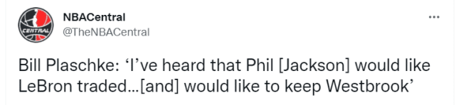 Bill Plaschke说道:“我刚刚得到的消息,我听说菲尔-杰克逊希望交易詹姆斯。我也知道他想要留下威少,并努力和他合作。”此前有报道称,杰克逊虽然在湖人队没有职务,但拥有话语权,在多项工作上给出建议。据悉,杰克逊是威少的粉丝,很喜欢威少。