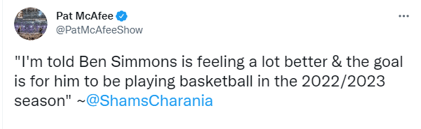 名记Shams在节目中表示:我被告知,本西在完成手术后感觉已好了很多,他现在的目标是在22-23赛季回归赛场。篮网队内对于本西的期望是,希望他能恢复到三次入选全明星和两次入选年度最佳防守阵容时的状态。