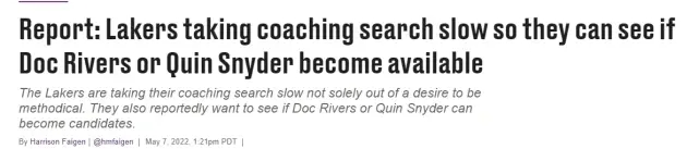 名记马克-斯坦恩也报道了湖人选帅的进展。湖人管理层希望选帅工作有条不紊,不想操之过急就决定人选。这一点,从湖人在炒掉沃格尔近一个月后才开始首次主帅面试就看得出来。斯坦恩表示,他们还在等两个人, 一位是76人队主帅里弗斯,另一位是爵士队主帅斯奈德。里弗斯目前还在率队打季后赛,总比分1-2落后热火;斯奈德刚接受了髋关节手术。要确认上述两人是否有可能执教湖人,可能还需要几周的时间。