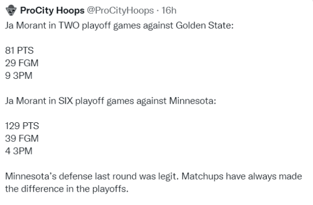 有美媒晒出了莫兰特在两轮系列赛中的表现对比。对勇士的两场系列赛,莫兰特一共得到81分,投中29球,三分球命中9个;对森林狼的六场系列赛,莫兰特一共得到129分,投中39球,三分球只进了4个。莫兰特对勇士命中率46.8%,对森林狼只有38.6%。