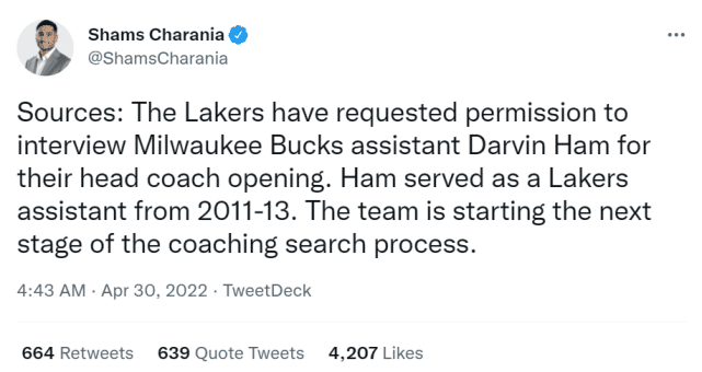 24直播网04月30日讯 ,名记查拉尼亚报道了湖人选帅的最新进展,他们已经提交了面试雄鹿助教达尔文-汉姆的申请,另据名记马克-斯坦恩报道,湖人对爵士主教练斯奈德也非常有兴趣,如果爵士和斯奈德分道扬镳,湖人也会考虑邀请他来执教。