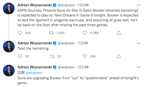 布克腿筋拉伤后已经养伤一周多,医学专家Rajpal Brar表示,这是腿筋一级拉伤休战一周的时间相吻合;另一医学专家Evan Jeffries表示布克将在赛前热身测试腿筋,腿筋受伤后的第9天,一级拉伤的愈合时间是7-10天,复出可能有伤势加重的风险。