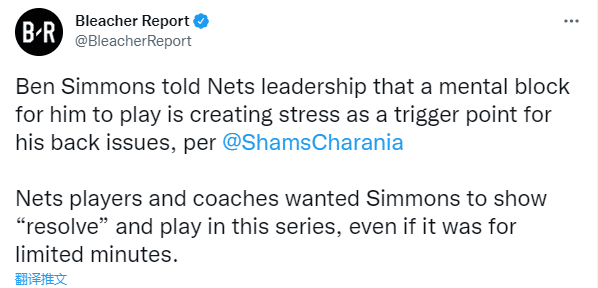 Shams还表示篮网管理层告知西蒙斯,球队愿意做任何事情来支持他,并为他提供任何必要的资源。而双方都希望能保持沟通,在接下来的休赛期继续努力,以做好让西蒙斯再次踏上球场的准备。