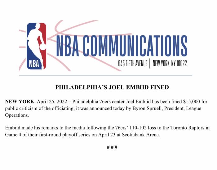 你的位置: 24直播网 篮球直播 NBA NBA官方罚单:恩比德因批评裁判被罚1.5万,灰熊主帅被罚拒让球员交罚款