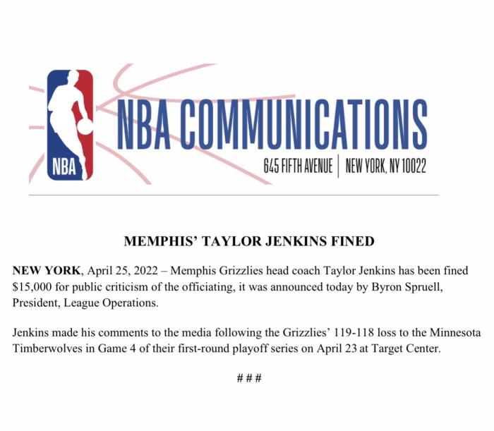 灰熊主帅也被罚款1.5万美元