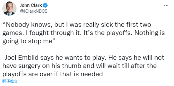 恩比德还表示他想继续带伤打比赛,他不会对拇指做手术,如果需要,他也会等到季后赛结束后做;恩比德还透露之前带病出战,表示:前两场比赛我病了,没有人知道这一点。我战胜了它,这就是季后赛,没有什么能够阻止我。