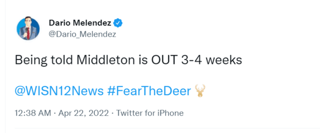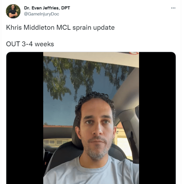 米德尔顿的预估伤停3-4周的消息出来后,Evan Jeffries在社媒上发视频说道:“这意味着他遭遇的很可能是二级扭伤,常规赛期间,杜兰特和戴维斯都遭遇过类似的伤病,他们休战了6周,季后赛通常会迫使球员更早回归。如果雄鹿能打到东部决赛或者总决赛,米德尔顿应该能回到场上。当然,他可能会让自己更早回来。”
