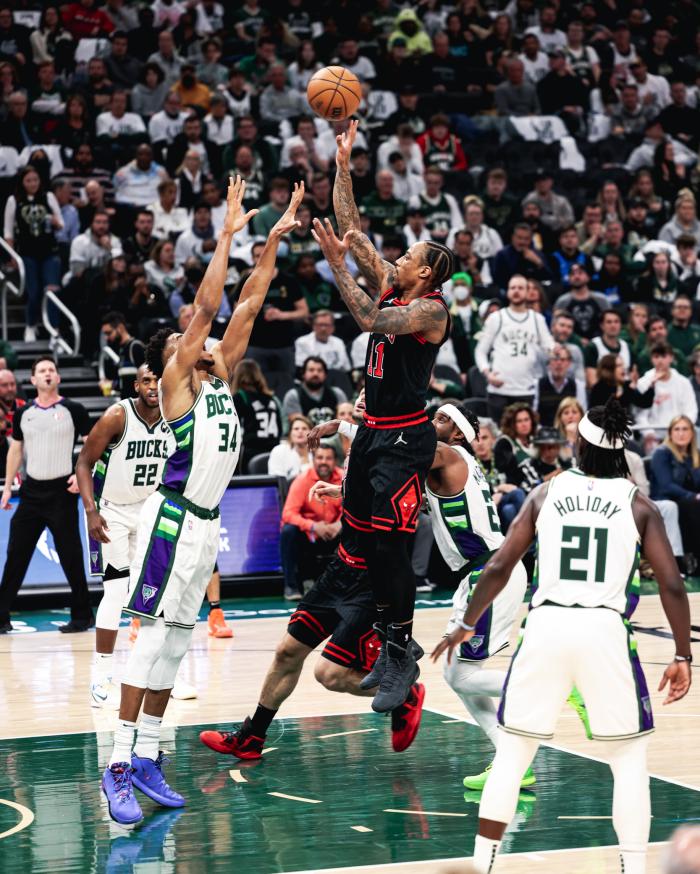 24直播网04月21日讯 ,NBA季后赛公牛客场大胜掀翻卫冕冠军,系列赛大比分变成1-1,德罗赞全场出战44分钟,31投16中狂砍41分7篮板4助攻2盖帽1抢断,得分创季后赛生涯新高,多次单挑迎射字母哥太狠,联盟中投之王回来了;字母哥输球,成为雄鹿队史季后赛得分王和抢断王之夜遭遇里程悲。