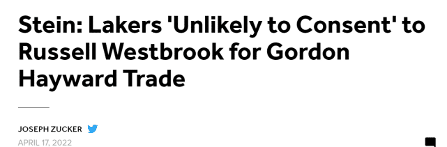 据名记马克-斯坦恩报道,湖人不太可能同意用威少换来以戈登-海沃德为核心的筹码。虽然湖人在威少的相关交易中并不占据有利地位,但球队在探索相关选择时依然会小心翼翼,不会随意甩卖威少。斯坦恩还表示“伤病史”将是湖人在任何交易里的首要考虑因素。