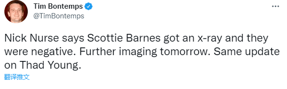 本场比赛,巴恩斯首发上场31分钟,6投4中拿到15分10篮板8助攻1盖帽,脚踝伤势令人担忧;赛后猛龙主帅纳斯表示巴恩斯的X光检查结果呈阴性,相当于没有结构性损伤。