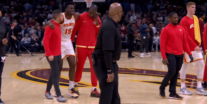 上半场最后几十秒,卡佩拉防守时被莫布里假动作晃飞,随后卡佩拉背后拉人犯规,莫布里被拉倒,结果卡佩拉被倒地的莫布里压伤膝盖,膝盖反关节受伤倒地,捂着膝盖十分痛苦,老鹰队医走上来,之后卡佩拉被两人搀扶离场,一瘸一拐十分难受,右腿无法用力。