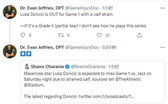对于东契奇的伤情,医学专家Evan Jeffries表示东契奇因伤缺席首轮第一场比赛,如果是小腿二级拉伤,他将无法出战这个系列赛。