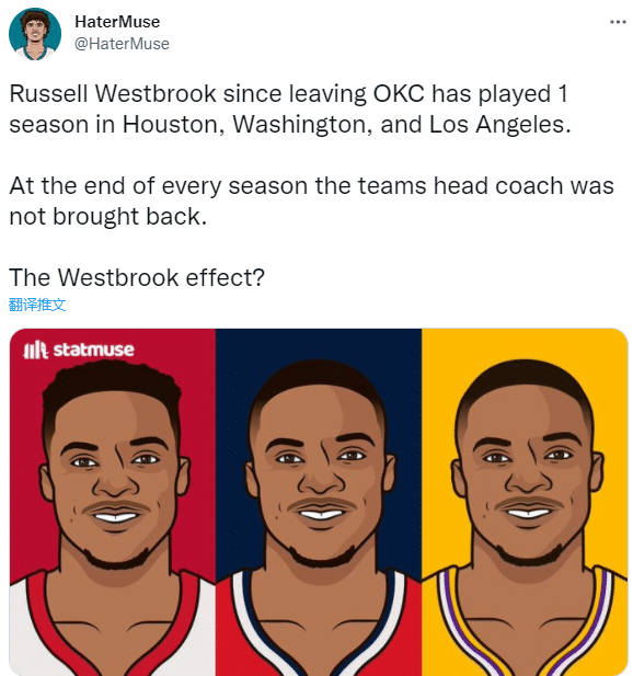 美媒更是晒出威少变成“主帅杀手”——在离开雷霆后,威少先后为火箭、奇才和湖人效力一个赛季,赛季结束这三个球队的主帅都离开了。