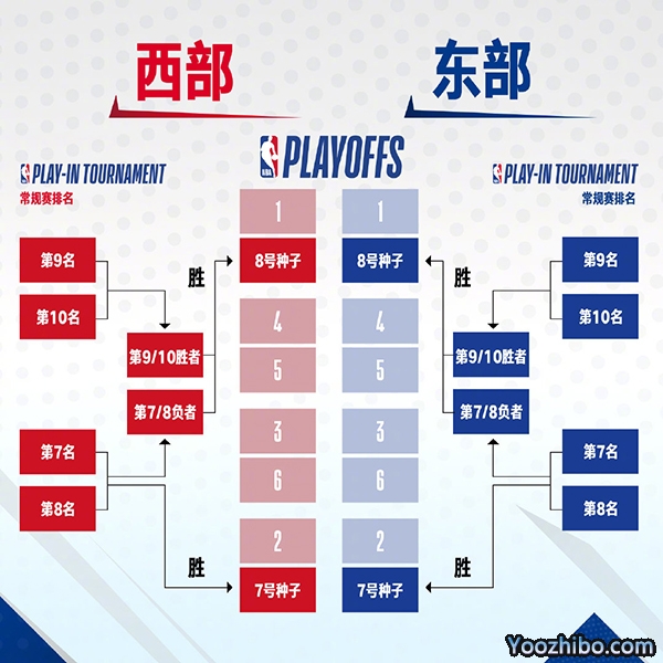常规赛结束后将进行附加赛,从而确定分区第7和第8的排位,每个分区排在第7-10名球队都有冲击季后赛的可能。附加赛的具体赛制为:各分区第7和第8的球队先进行附加赛,胜者直接成为分区第7号种子(排位第7的球队只需一胜就可以拿到第7号种子,第8名需要两场胜利);第9和第10的球队再进行新的附加赛,胜者将于第7和第8名的败者再进行一场比赛,胜者成为分区第8号种子,值得一提的是,第9、10名的球队必须两战全胜,才可晋级。