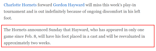 海沃德在2月8日扭伤脚踝,并连续缺席22场比赛。这位昔日的全明星在4月3日对费城的比赛中复出,打了17分钟,但随后他又再次缺席,已经连续四场休战。