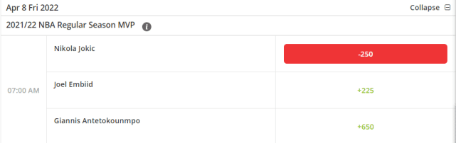 约基奇对掘金的贡献,显然是全方位的。如果说有什么能阻止约基奇蝉联MVP奖项,那可能就是掘金的战绩了。赛季至今,掘金47胜33负,暂居西部第六,不过没有穆雷和波特的情况下,掘金还能打出这样的成绩,也很不容易了。最新赔率显示,约基奇(-250)领跑MVP竞争,排名第二的是恩比德,第三是字母哥。