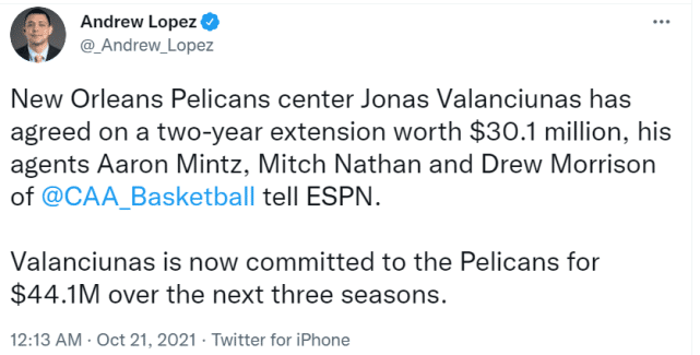 来源:24直播网10-21 16:1424直播网10月21日讯 ,据ESPN记者Andrew Lopez报道,瓦兰丘纳斯与鹈鹕提前续签了一份2年3010万美元的合同,算上他余下的1年合同,未来3年,瓦兰丘纳斯的合同是3年4410万。