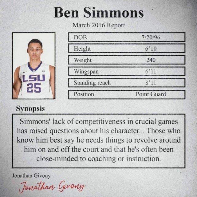 撰写这份报告的是知名选秀专家Jonathan Givony,报告上除了西蒙斯的身高、体重、臂展等基本资料,还有缺点一栏。在这一栏里,当时Givony写道:“西蒙斯在关键的比赛中缺少竞争力,让人们对他的性格产生了一些质疑……据非常了解他的人透露,西蒙斯需要场内场外的所有事情都围着他转,而且他通常会对执教和指导持封闭态度。”