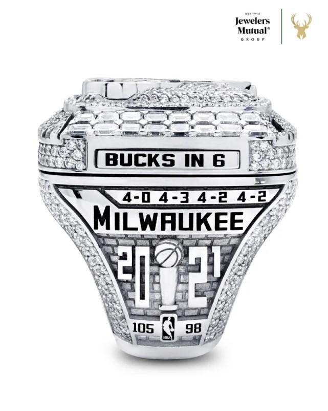 雄鹿戒指的一侧是雄鹿的口号FEAR THE DEER,球员的名字,球员的号码,而另一侧是Bucks in 6, 代表雄鹿6战夺冠,还有雄鹿每一轮季后赛的比分以及2021年夺冠的标志。